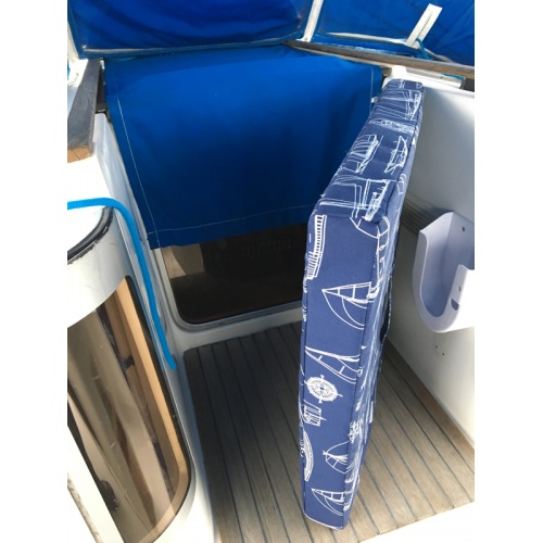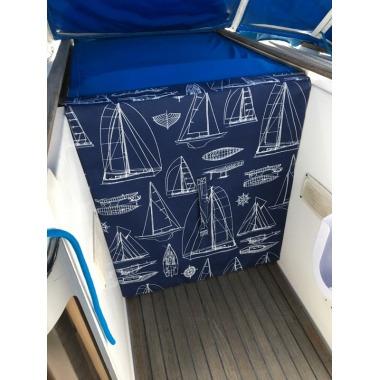 So what exactly is a Door Baffle. It is a boat canvas creation that take the place of hatch boards when you are onboard. The Door Baffle block the companionway door, keeping heat out and cold in during the some and just the reverse in the winter. Rather than removing and replacing hatch each time you enter or exit the cabin. Just grab the handle on the door baffle when you need to move it and then replace it when you are done. Simple one handed operation, you don't even have to set your drink or your sandwich down.